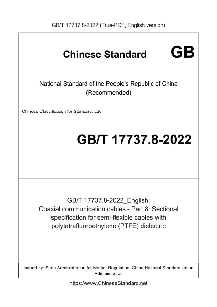 Delivery: <= 3 days. True-PDF full-copy in English will be manually translated and delivered via email. GB/T 17737.8-2022: Coaxial communication cables - Part 8: Sectional specification for semi-flexible cables with polytetrafluoroethylene (PTFE) dielectric Status: Valid
