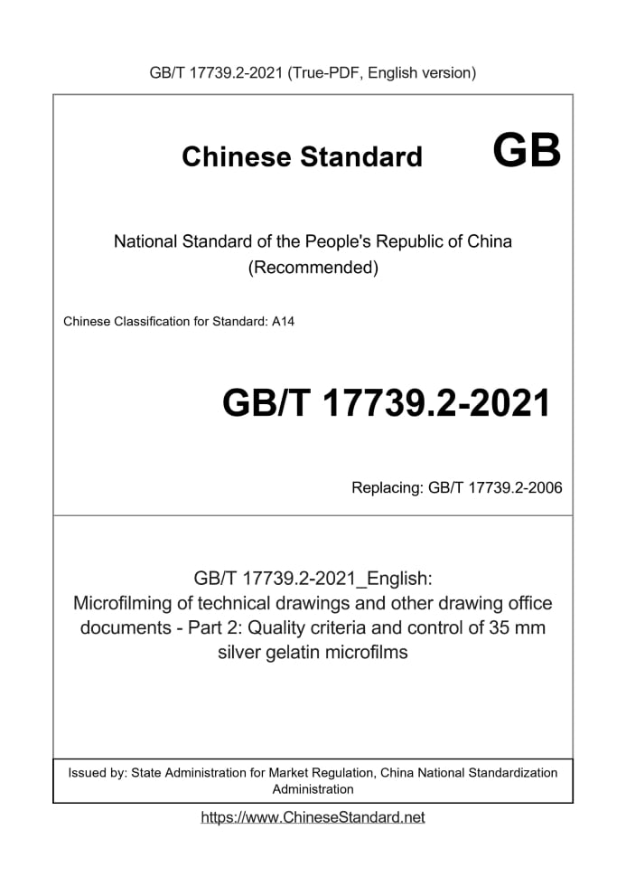Delivery: <= 3 days. True-PDF full-copy in English will be manually translated and delivered via email. GB/T 17739.2-2021: Microfilming of technical drawings and other drawing office documents - Part 2: Quality criteria and control of 35 mm silver gelatin microfilms Status: Valid GB/T 17739.2: Historical versions