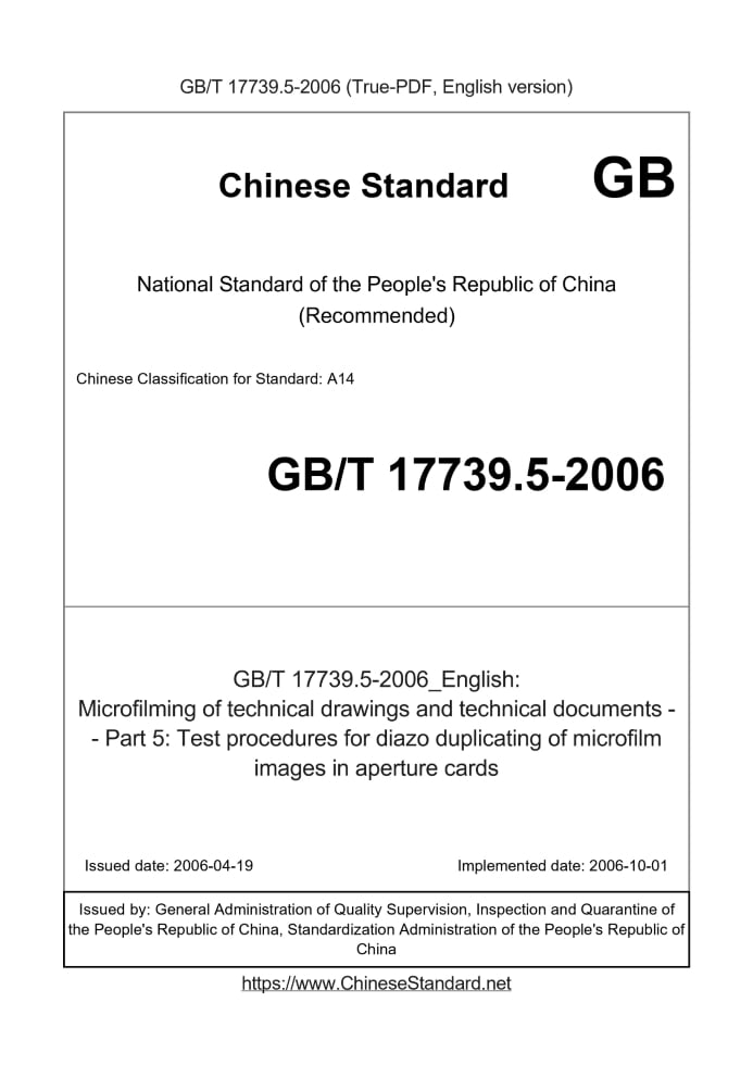 GB/T 17739.5-2006: Microfilming of technical drawings and technical documents -- Part 5: Test procedures for diazo duplicating of microfilm images in aperture cards