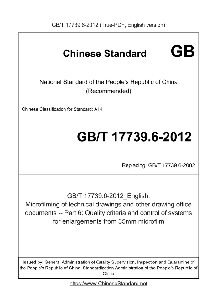 Basic dataStandard ID: GB/T 17739.6-2012 (GB/T17739.6-2012)Description (Translated English): Microfilming of technical drawings and other drawing office documents -- Part 6: Quality criteria and control of systems for enlargements from 35mm microfilm Sector / Industry: National Standard (Recommended) Classification of Chinese Standard: A14 Classification of International Standard: 37.080 Word Count Estimation: 7,722 Older Standard (superseded by this standard): GB/T 17739.6-2002 Quoted Standard: GB/T 6159.1-2003; GB/T 6159.2-2011; GB/T 6159.3-2003; GB/T 6159.4-2003; GB/T 6159.5-2011; GB/T 6159.6-2003; GB/T 6159.7-2011; GB/T 6161-2008; GB/T 17739.1-2008; GB/T 17739.2-2006; GB/T 18405-2008 Adopted Standard: ISO 3272-6-2000, MOD Regulation (derived from): National Standards Bulletin No. 41 of 2012 Issuing agency(ies): General Administration of Quality Supervision, Inspection and Quarantine of the People's Republic of China, Standardization Administration of the People's Republic of China Summary: This standard specifies the microfiche copies amplification system and amplify amplify the minimum quality requirements and readability test methods. This section applies to technical drawings and technical documents enlarged microfilm copies. GB/T 17739.6-2012: Microfilming of technical drawings and other drawing office documents -- Part 6: Quality criteria and control of systems for enlargements from 35mm microfilm---This is a DRAFT version for illustration, not a final translation. Full copy of true-PDF in English version (including equations, symbols, images, flow-chart, tables, and figures etc.) will be manually/carefully translated upon your order. ICS37.080 A14 National Standards of People's Republic of China Replacing GB/T 17739.6-2002 Microfilming of technical drawings and technical documents Part 6. 35mm microfilm amplification system Quality criteria and control documents-Part 6. Qualitycriteriaandcontrolofsystemsforenlargements from35mmmicrofilm (ISO 3272-6.2000, MOD) Issued on. 2013-06-01 2012-12-31 implementation Administration of Quality Supervision, Inspection and Quarantine of People's Republic of China Standardization Administration of China released ForewordGB/T 17739 "technical drawings and technical documents microfilming" is divided into the following sections. --- Part 1. Operating procedures; Part --- Article 2. 35mm silver - gelatin microforms quality guidelines and testing; Part --- Section 3. 35mm microfilm aperture cards; --- Part 4. Special and oversized pattern shooting; --- Part 5. microfilm images in aperture cards diazo copy testing procedures; --- Part 6. Quality criteria and control of systems for enlargements from 35mm microfilm. This is Part 6 GB/T 17739 in. Rules in this section in accordance with GB/T 1.1-2009 given draft. This Part replaces GB/T 17739.6-2002 "Micrographics Part 6 of technical drawings and technical documents. 35mm microfilm Quality guidelines and controls "amplification system. This part of GB/T 17739.6-2002 compared to the main technical changes are as follows. --- Normative references cited in the latest version of the relevant national standards; increased GB/T 17739.1-2008; the GB/T 14691-1993 shifted reference (see Chapter 2 and references therein); --- Remove the "Table 1A magnification and copy size specifications of the original series microform (recommended)" (Chapter 4, 2002 edition); --- Modify the "readability 5" in the requirements, "should be able to distinguish between listed in Table 1" in the "should" to "shall"; --- Amend Table 2 and Table 3 lists the part of error magnification and shrinkage, and the table numbers were changed to Tables 1 and 2 (see Chapter 5, Table 1, Table 2, 2002 edition of Tables 2 and 3). This section uses redrafted Law Amendment uses ISO 3272-6.2000 "Microfilming of technical drawings and other drawing office documents 6 Part I. Quality criteria and control "35mm microfilm amplification system. This portion of the ISO 3272-6.2000 technical differences and their reasons are as follows. --- On normative references, this part has been adjusted technical differences, in order to adapt our technical conditions adjustment situation Focus is reflected in the status of Chapter 2, "Normative references" on. --- Modify the "readability 5" in the requirements of the first paragraph "should be able to distinguish between listed in Table 1" in the "should" to "shall", with the first Requires three segments coincide, because in line with ISO 3272-2.1994 Results of the test piece is only a test. --- Modify the "readability 5" in Table 1 and Table 2 lists the part incorrect magnification and shrinkage to the ISO 3272-1.2003 Provisions consistent, also in line with the actual work. --- Revised "Appendix A" of the error, the last paragraph in the second row with the wrong "density" (density) to "contrast" (con- trast). This part made the following editorial changes. --- Decimal symbol used in place of ",". ","; --- Remove the original preface to the international standards; --- Remove the original introduction of international standards. Please note that some of the content of this document may involve patent issuing authority of this document does not assume responsibility for the identification of these patents. This part of the National Document Imaging Technology Standardization Technical Committee (SAC/TC86) and focal points. This section drafted by. National Information Technology Standardization Technical Committee Document Imaging six Branch, National Archives files Institute of Science and Technology. The main drafters of this section. Neyman Movies, Wei clever. This part of the standard replaces the previous editions are. --- GB/T 17739.6-2002. Microfilming of technical drawings and technical documents Part 6. 35mm microfilm amplification system Quality criteria and control1 ScopeThis section GB/T 17739 specifies the minimum requirements for readability amplification systems and microfilm copies of the amplif