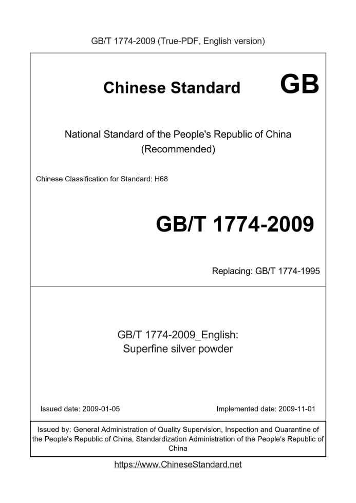 Delivery: <= 3 days. True-PDF full-copy in English will be manually translated and delivered via email. GB/T 1774-2009: Superfine silver powder Status: Valid GB/T 1774: Historical versions