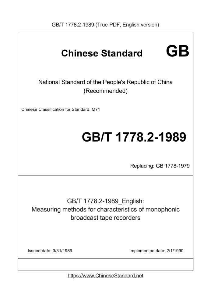 Delivery: <= 3 days. True-PDF full-copy in English will be manually translated and delivered via email. GB/T 1778.2-1989: Measuring methods for characteristics of monophonic broadcast tape recorders Status: Obsolete