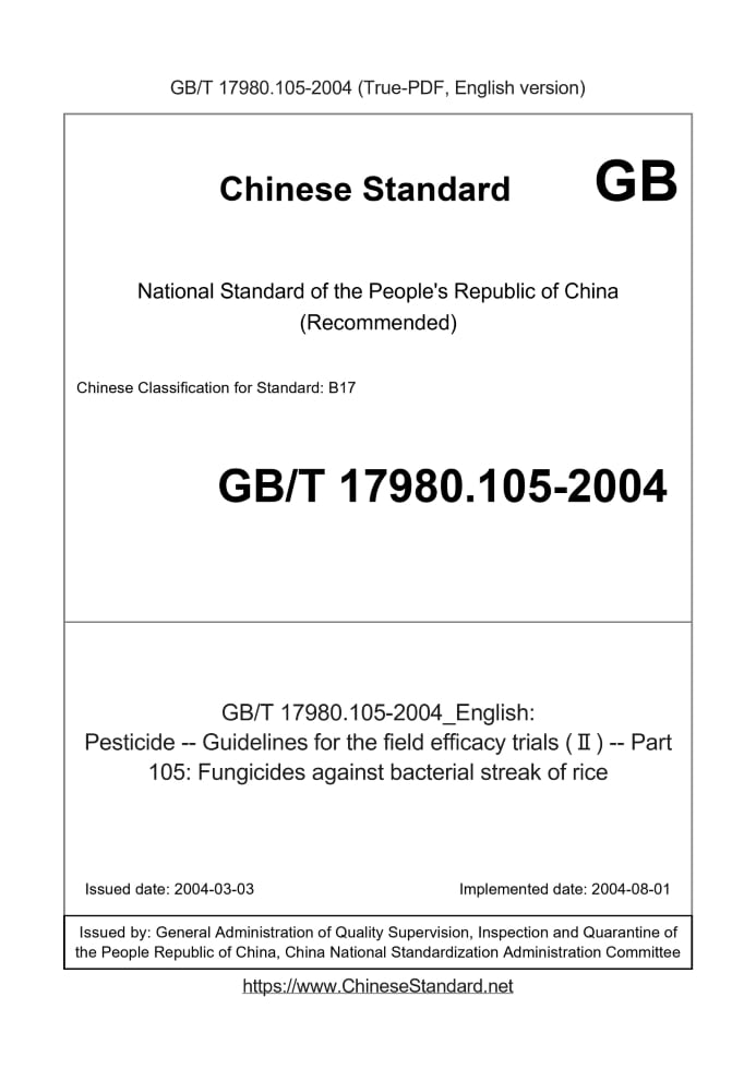 Delivery: <= 2 days. True-PDF full-copy in English will be manually translated and delivered via email. GB/T 17980.105-2004: Pesticide -- Guidelines for the field efficacy trials (Ⅱ) -- Part 105: Fungicides against bacterial streak of rice Status: Valid