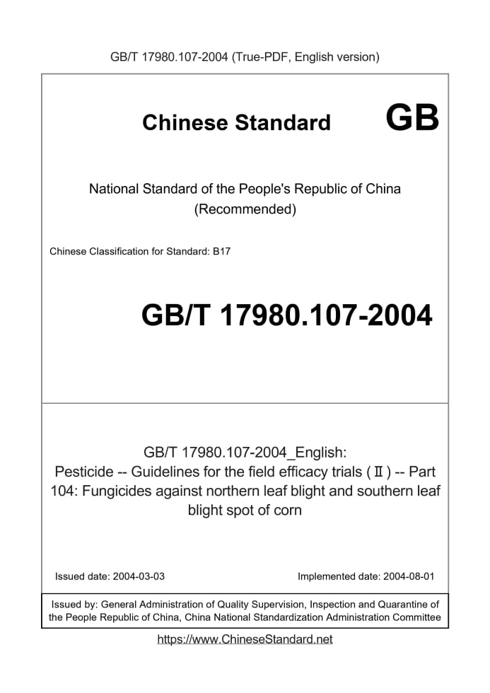 GB/T 17980.107-2004: Pesticide -- Guidelines for the field efficacy trials (Ⅱ) -- Part 104: Fungicides against northern leaf blight and southern leaf blight spot of corn