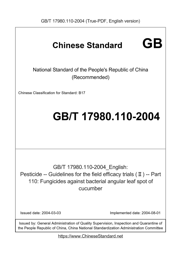 GB/T 17980.110-2004: Pesticide -- Guidelines for the field efficacy trials (Ⅱ) -- Part 110: Fungicides against bacterial angular leaf spot of cucumber