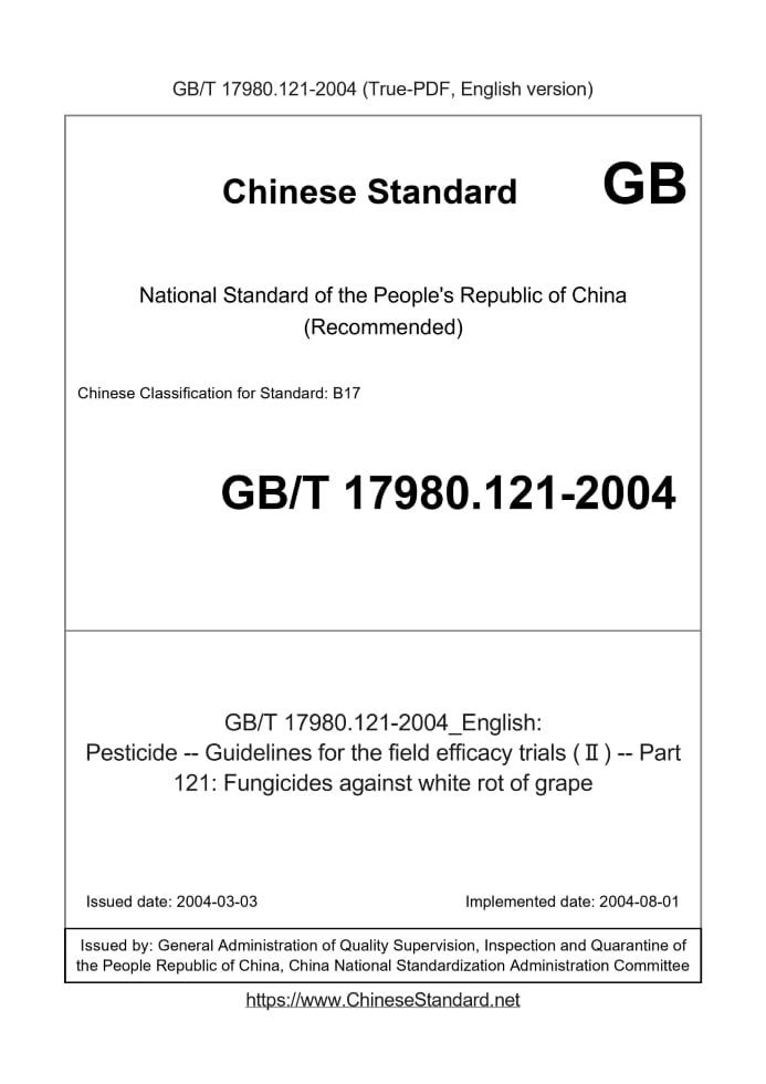 Delivery: <= 2 days. True-PDF full-copy in English will be manually translated and delivered via email. GB/T 17980.121-2004: Pesticide -- Guidelines for the field efficacy trials (Ⅱ) -- Part 121: Fungicides against white rot of grape Status: Valid