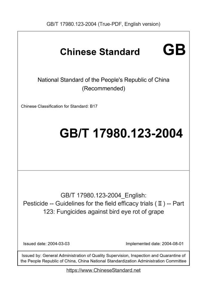 GB/T 17980.123-2004: Pesticide -- Guidelines for the field efficacy trials (Ⅱ) -- Part 123: Fungicides against bird eye rot of grape