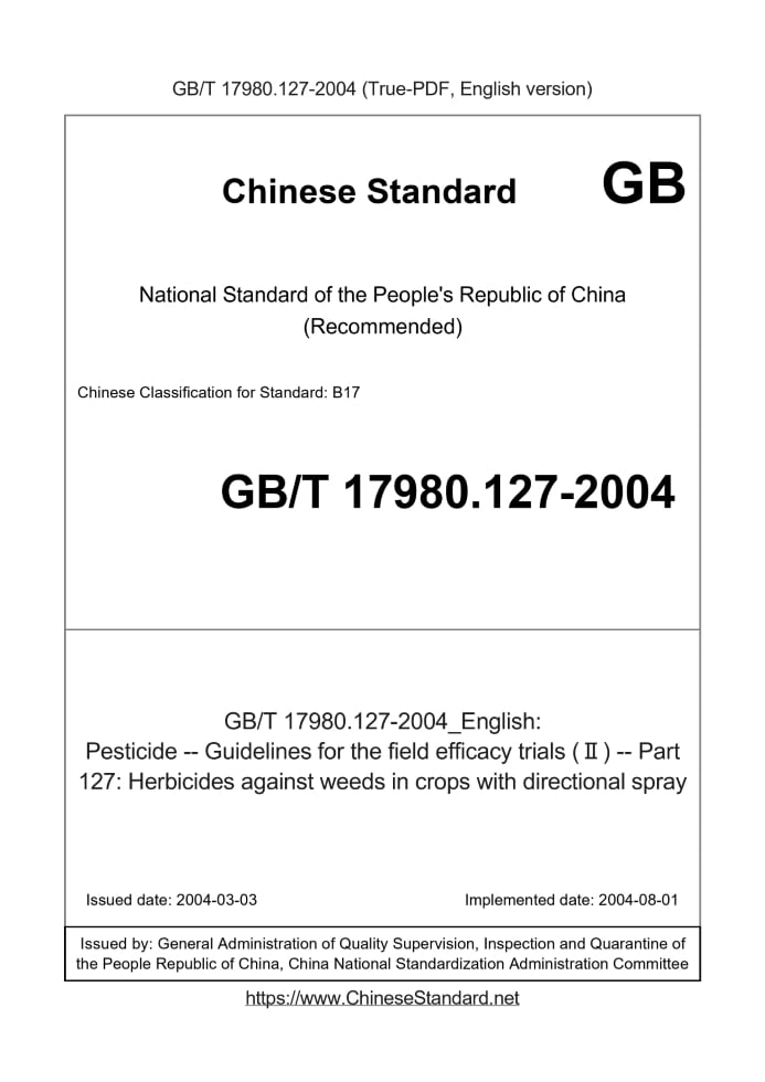 Delivery: <= 2 days. True-PDF full-copy in English will be manually translated and delivered via email. GB/T 17980.127-2004: Pesticide -- Guidelines for the field efficacy trials (Ⅱ) -- Part 127: Herbicides against weeds in crops with directional spray Status: Valid