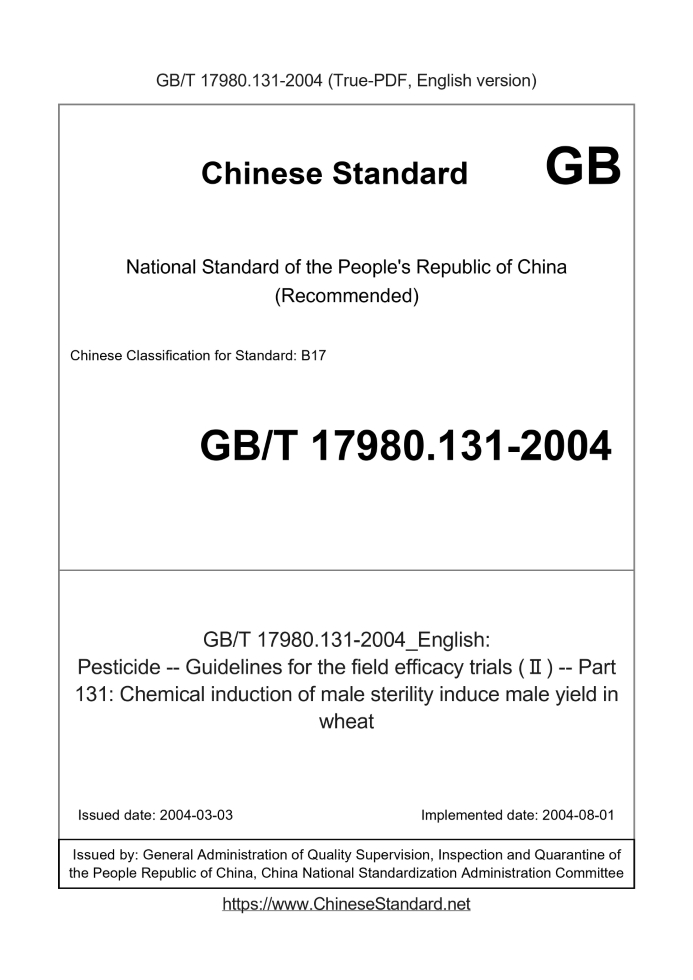 Delivery: <= 2 days. True-PDF full-copy in English will be manually translated and delivered via email. GB/T 17980.131-2004: Pesticide -- Guidelines for the field efficacy trials (Ⅱ) -- Part 131: Chemical induction of male sterility induce male yield in wheat Status: Valid