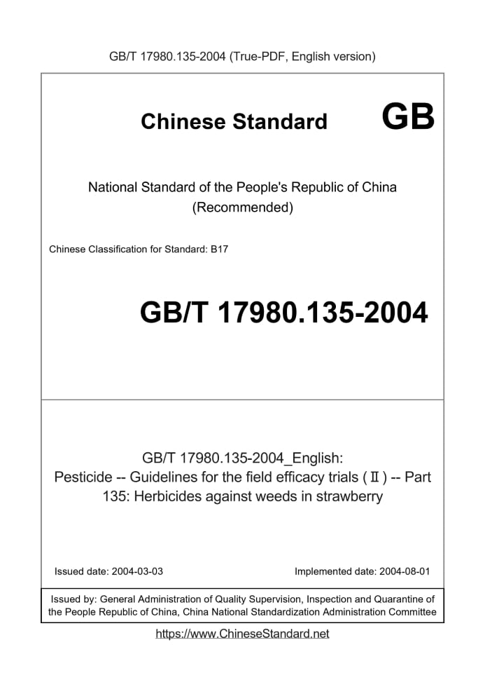 Delivery: <= 3 days. True-PDF full-copy in English will be manually translated and delivered via email. GB/T 17980.135-2004: Pesticide -- Guidelines for the field efficacy trials (Ⅱ) -- Part 135: Herbicides against weeds in strawberry Status: Valid