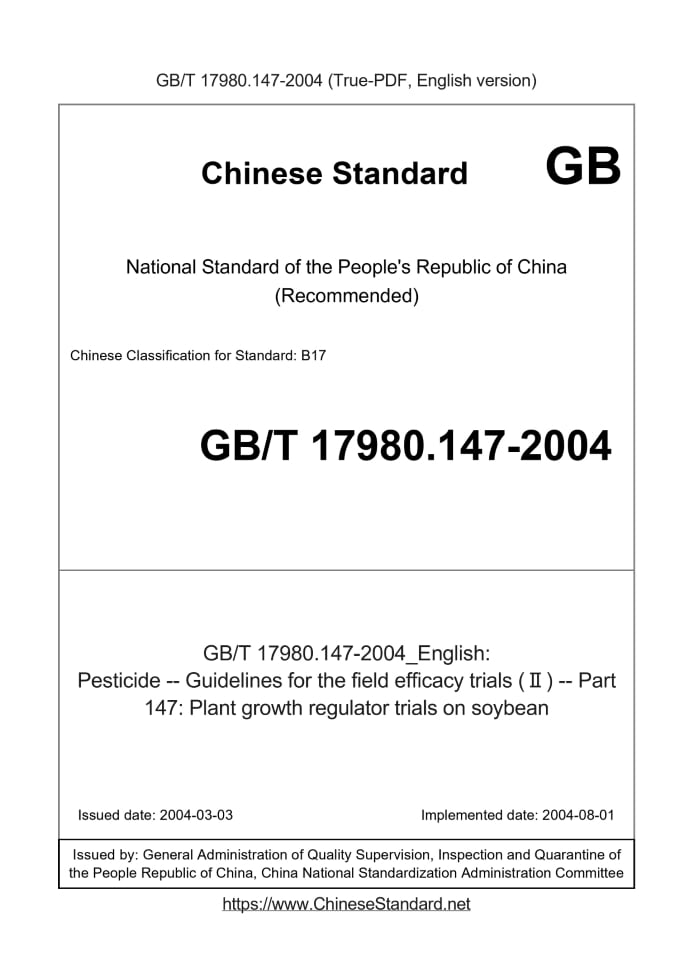 Delivery: <= 2 days. True-PDF full-copy in English will be manually translated and delivered via email. GB/T 17980.147-2004: Pesticide -- Guidelines for the field efficacy trials (Ⅱ) -- Part 147: Plant growth regulator trials on soybean Status: Valid