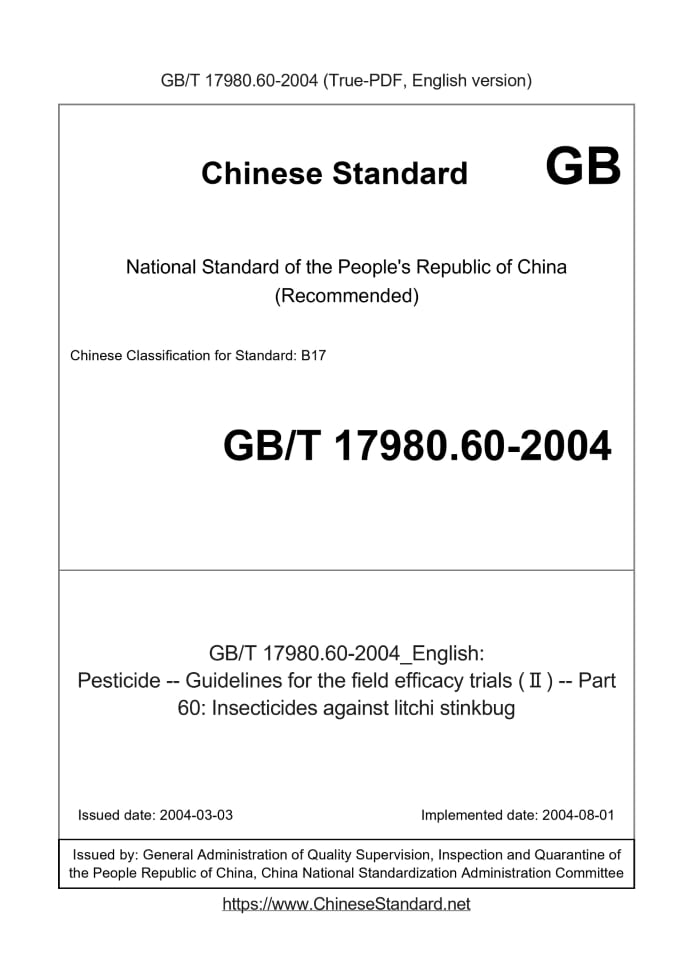 Delivery: <= 2 days. True-PDF full-copy in English will be manually translated and delivered via email. GB/T 17980.60-2004: Pesticide -- Guidelines for the field efficacy trials (Ⅱ) -- Part 60: Insecticides against litchi stinkbug Status: Valid