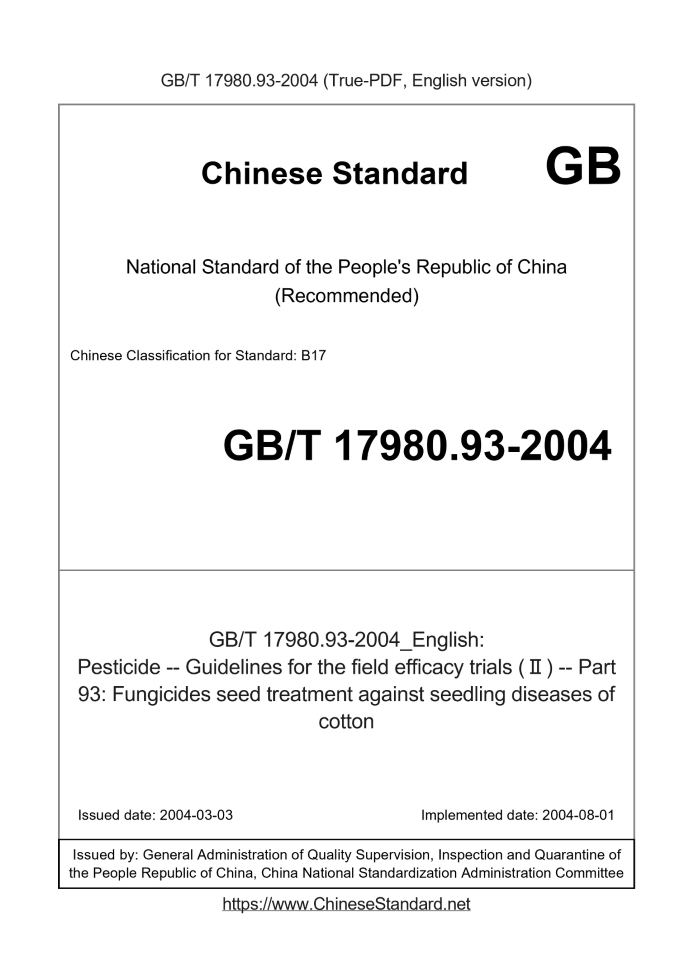 Delivery: <= 2 days. True-PDF full-copy in English will be manually translated and delivered via email. GB/T 17980.93-2004: Pesticide -- Guidelines for the field efficacy trials (Ⅱ) -- Part 93: Fungicides seed treatment against seedling diseases of cotton Status: Valid