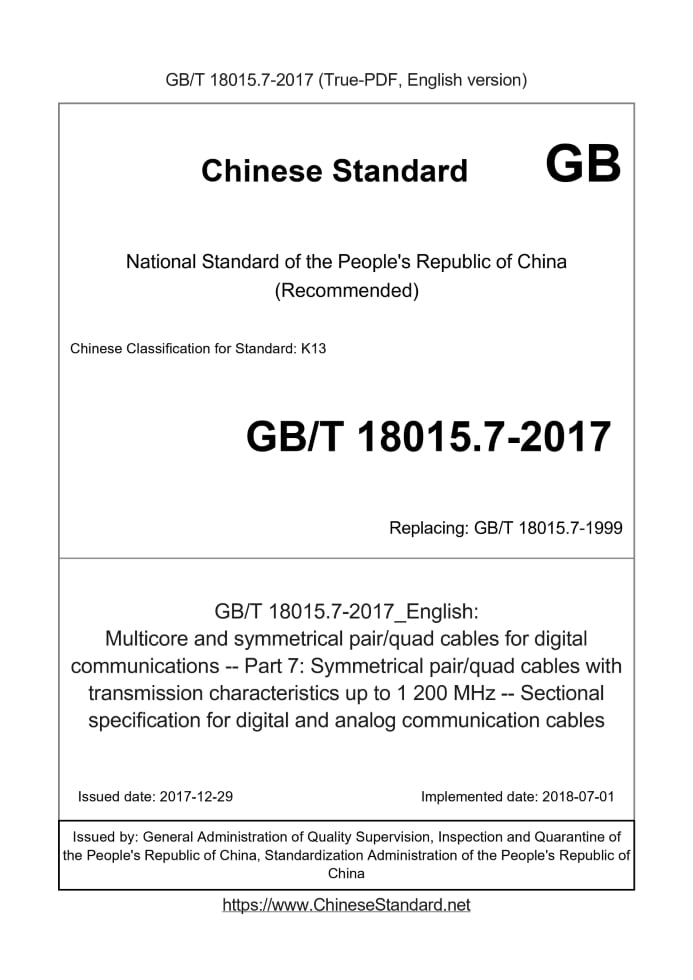 Delivery: <= 4 days. True-PDF full-copy in English will be manually translated and delivered via email. GB/T 18015.7-2017: Multicore and symmetrical pair/quad cables for digital communications -- Part 7: Symmetrical pair/quad cables with transmission characteristics up to 1 200 MHz -- Sectional specification for digital and analog communication cables Status: Valid GB/T 18015.7: Historical versions