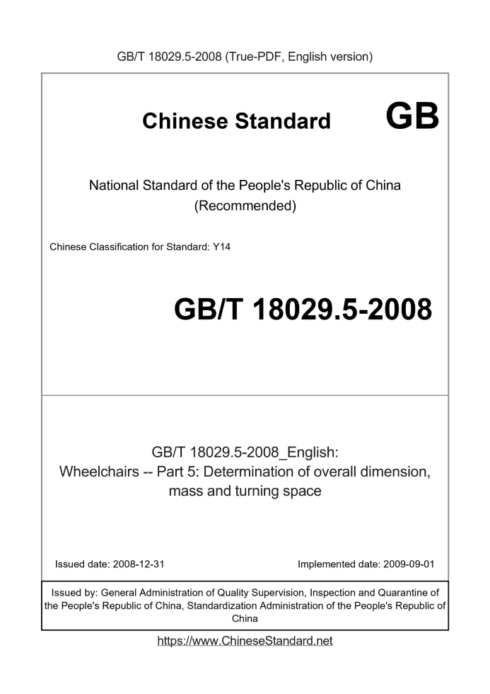 Delivery: <= 3 days. True-PDF full-copy in English will be manually translated and delivered via email. GB/T 18029.5-2008: Wheelchairs -- Part 5: Determination of overall dimension, mass and turning space Status: Obsolete