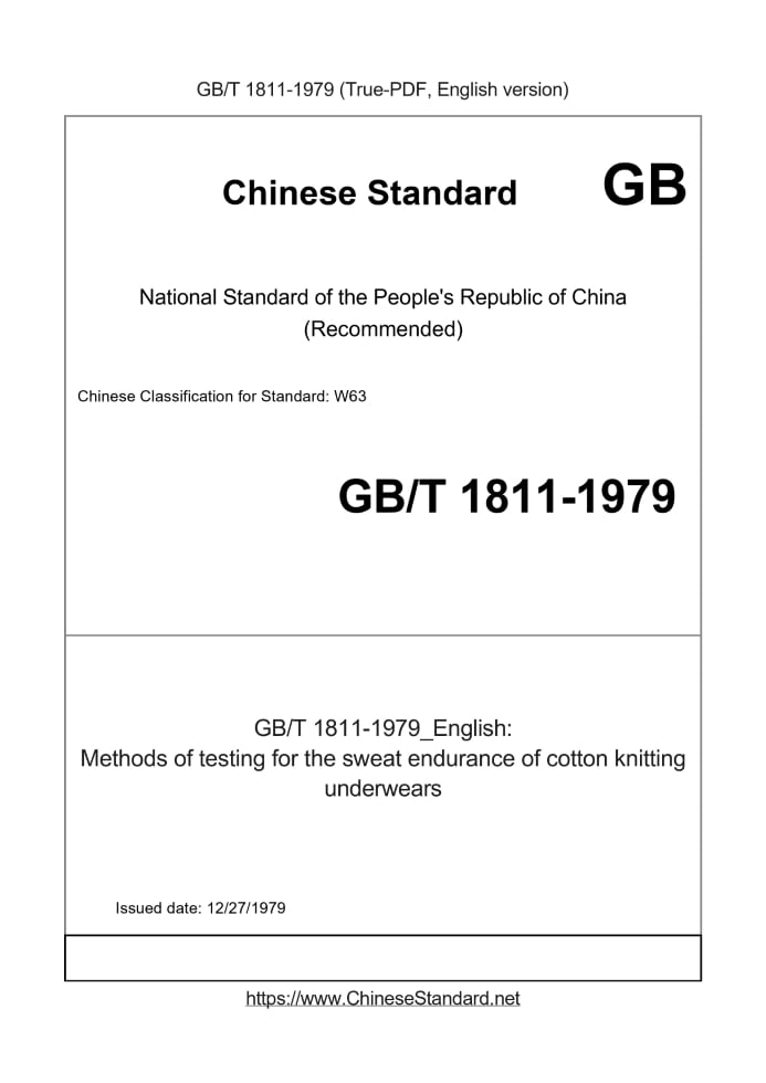 Delivery: <= 2 days. True-PDF full-copy in English will be manually translated and delivered via email. GB/T 1811-1979: Methods of testing for the sweat endurance of cotton knitting underwears Status: Obsolete