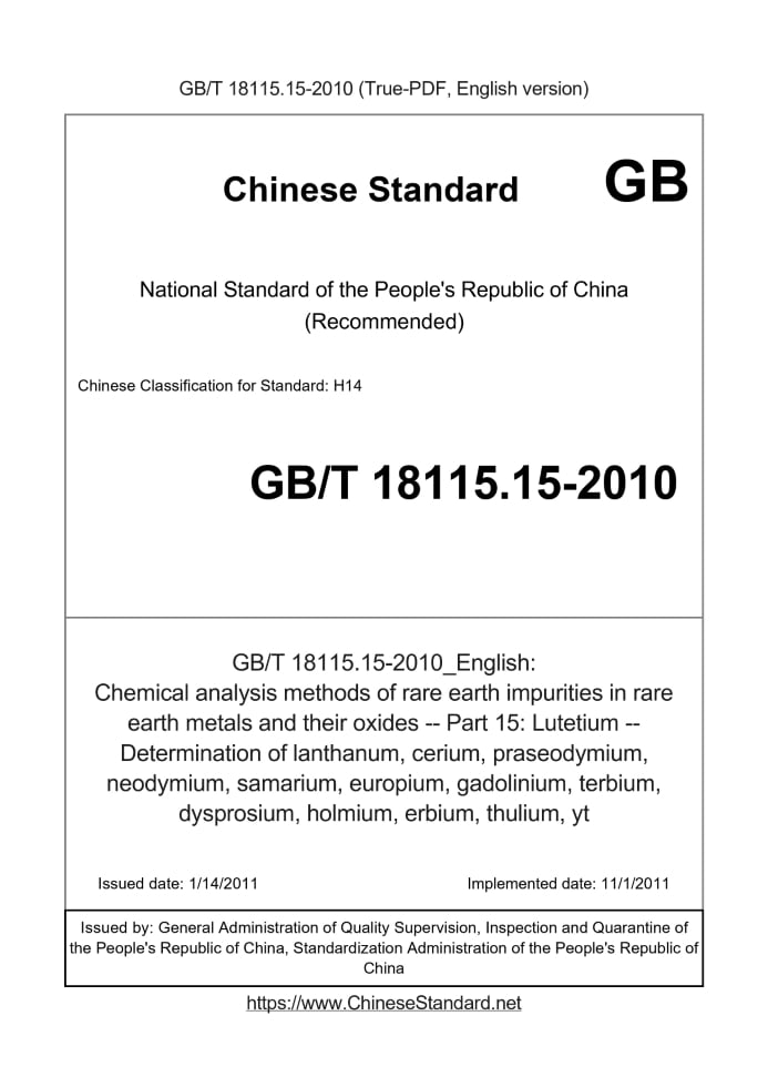 Delivery: <= 3 days. True-PDF full-copy in English will be manually translated and delivered via email. GB/T 18115.15-2010: Chemical analysis methods of rare earth impurities in rare earth metals and their oxides -- Part 15: Lutetium -- Determination of lanthanum, cerium, praseodymium, neodymium, samarium, europium, gadolinium, terbium, dysprosium, holmium, erbium, thulium, yt Status: Valid