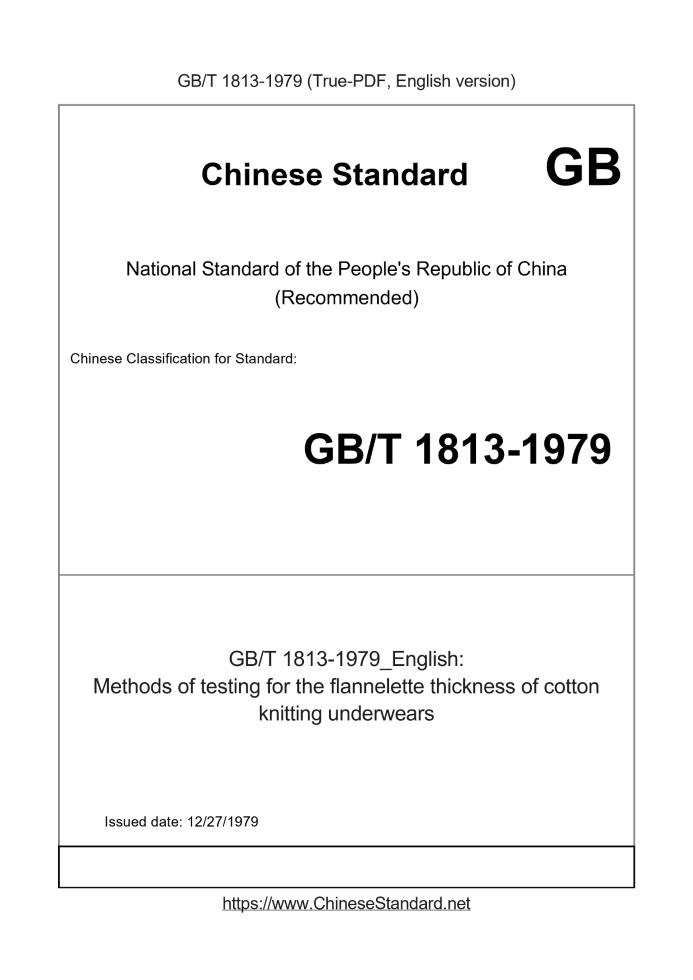Basic dataStandard ID: GB/T 1813-1979 (GB/T1813-1979)Description (Translated English): Methods of testing for the flannelette thickness of cotton knitting underwears Sector / Industry: National Standard (Recommended) Date of Issue: 12/27/1979 Tips & Frequently Asked Questions:Question 1: How long will the true-PDF of GB/T 1813-1979_English be delivered?Answer: Upon your order, we will start to translate GB/T 1813-1979_English as soon as possible, and keep you informed of the progress. The lead time is typically 1 ~ 3 working days. The lengthier the document the longer the lead time.Question 2: Can I share the purchased PDF of GB/T 1813-1979_English with my colleagues?Answer: Yes. The purchased PDF of GB/T 1813-1979_English will be deemed to be sold to your employer/organization who actually pays for it, including your colleagues and your employer's intranet.Question 3: Does the price include tax/VAT?Answer: Yes. Our tax invoice, downloaded/delivered in 9 seconds, includes all tax/VAT and complies with 100+ countries' tax regulations (tax exempted in 100+ countries) -- See Avoidance of Double Taxation Agreements (DTAs): List of DTAs signed between Singapore and 100+ countriesQuestion 4: Do you accept my currency other than USD?Answer: Yes. If you need your currency to be printed on the invoice, please write an email to Sales@ChineseStandard.net. In 2 working-hours, we will create a special link for you to pay in any currencies. Otherwise, follow the normal steps: Add to Cart -- Checkout -- Select your currency to pay. |
