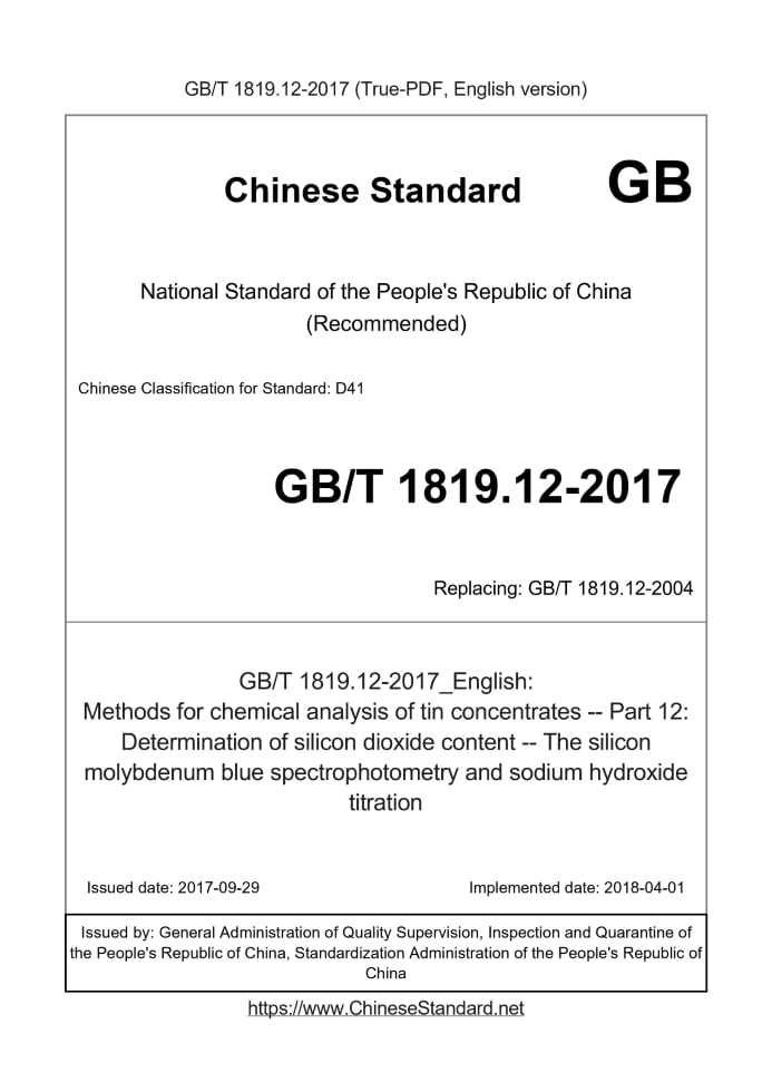 Delivery: <= 3 days. True-PDF full-copy in English will be manually translated and delivered via email. GB/T 1819.12-2017: Methods for chemical analysis of tin concentrates -- Part 12: Determination of silicon dioxide content -- The silicon molybdenum blue spectrophotometry and sodium hydroxide titration Status: Valid GB/T 1819.12: Historical versions