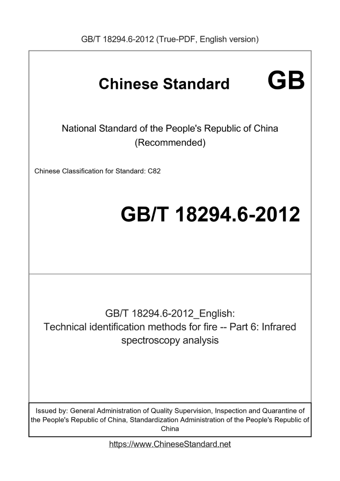 Delivery: <= 3 days. True-PDF full-copy in English will be manually translated and delivered via email. GB/T 18294.6-2012: Technical identification methods for fire -- Part 6: Infrared spectroscopy analysis Status: Valid