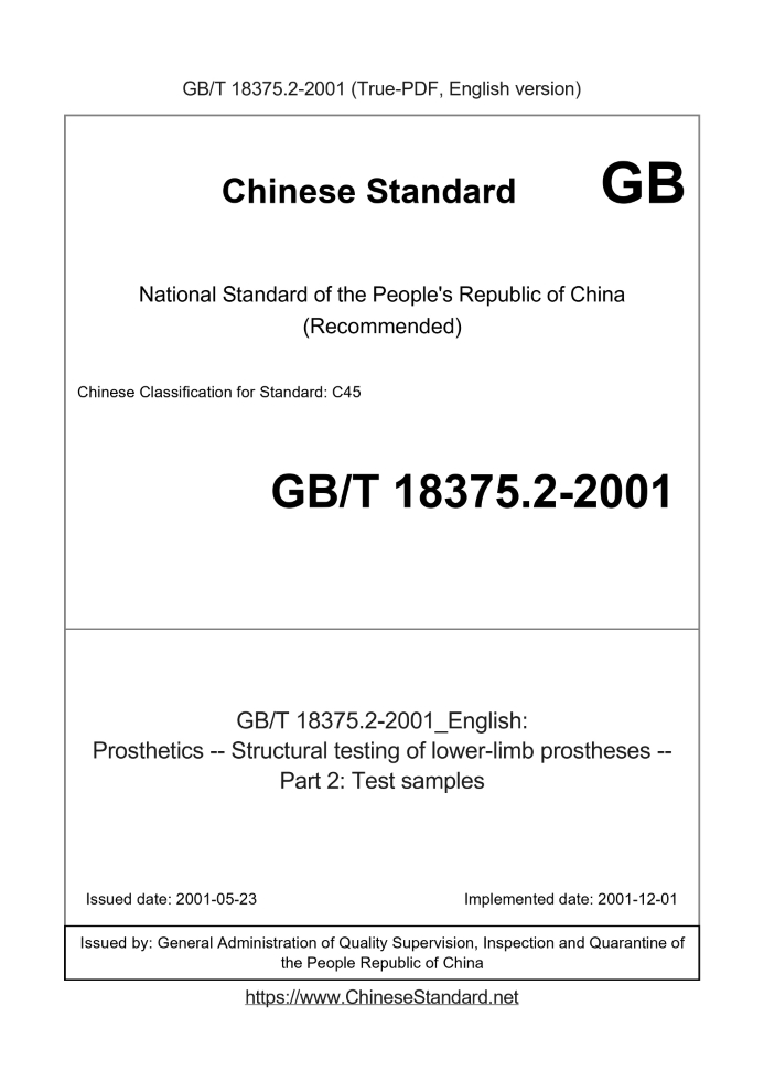 Delivery: <= 3 days. True-PDF full-copy in English will be manually translated and delivered via email. GB/T 18375.2-2001: Prosthetics -- Structural testing of lower-limb prostheses -- Part 2: Test samples Status: Valid