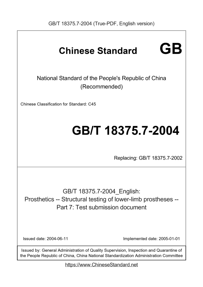 Delivery: <= 3 days. True-PDF full-copy in English will be manually translated and delivered via email. GB/T 18375.7-2004: Prosthetics -- Structural testing of lower-limb prostheses -- Part 7: Test submission document Status: Valid GB/T 18375.7: Historical versions