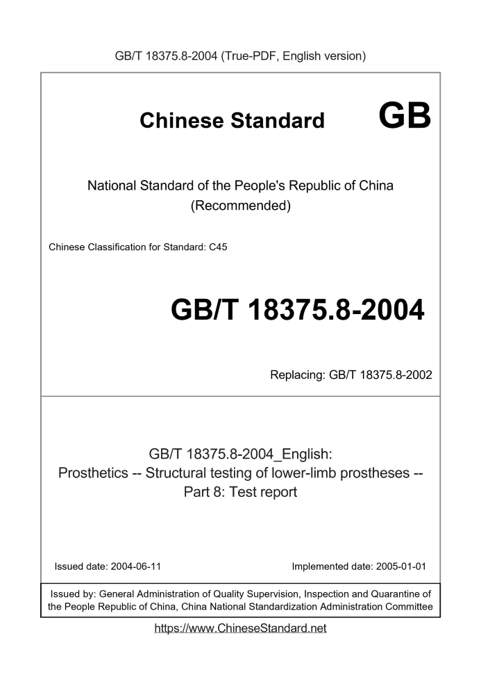 GB/T 18375.8-2002RFQ ASK 3 days Prosthetics-Structural testing of lower-limb prostheses-Part 8: Test report