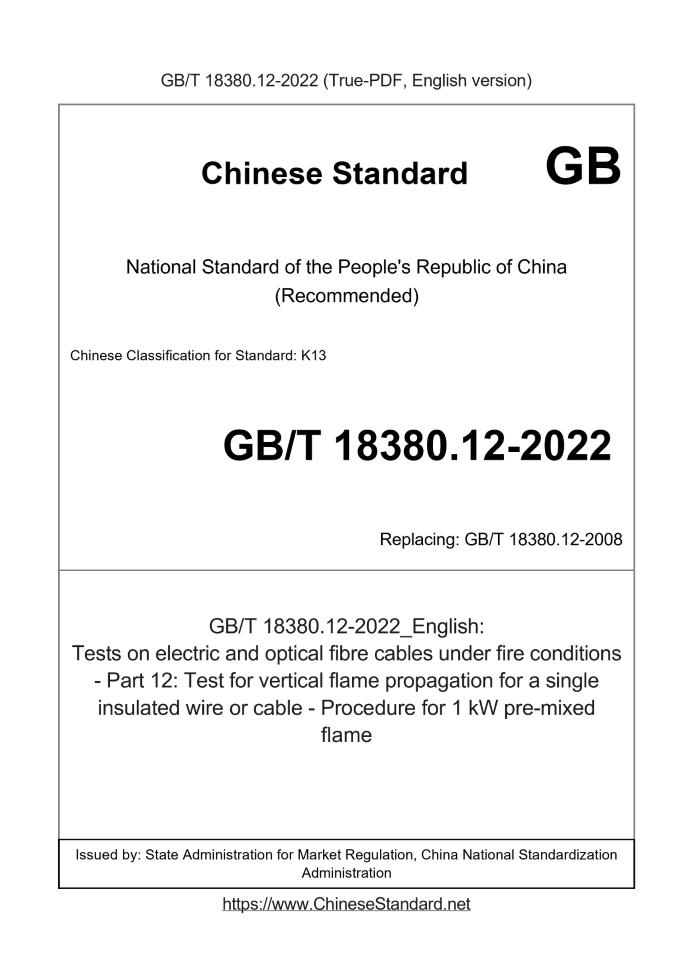 Delivery: <= 3 days. True-PDF full-copy in English will be manually translated and delivered via email. GB/T 18380.12-2022: Tests on electric and optical fibre cables under fire conditions - Part 12: Test for vertical flame propagation for a single insulated wire or cable - Procedure for 1 kW pre-mixed flame Status: Valid GB/T 18380.12: Historical versions