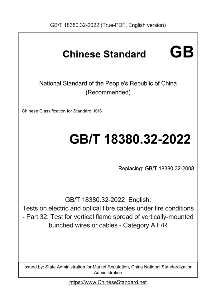 Delivery: <= 3 days. True-PDF full-copy in English will be manually translated and delivered via email. GB/T 18380.32-2022: Tests on electric and optical fibre cables under fire conditions - Part 32: Test for vertical flame spread of vertically-mounted bunched wires or cables - Category A F/R Status: Valid GB/T 18380.32: Historical versions