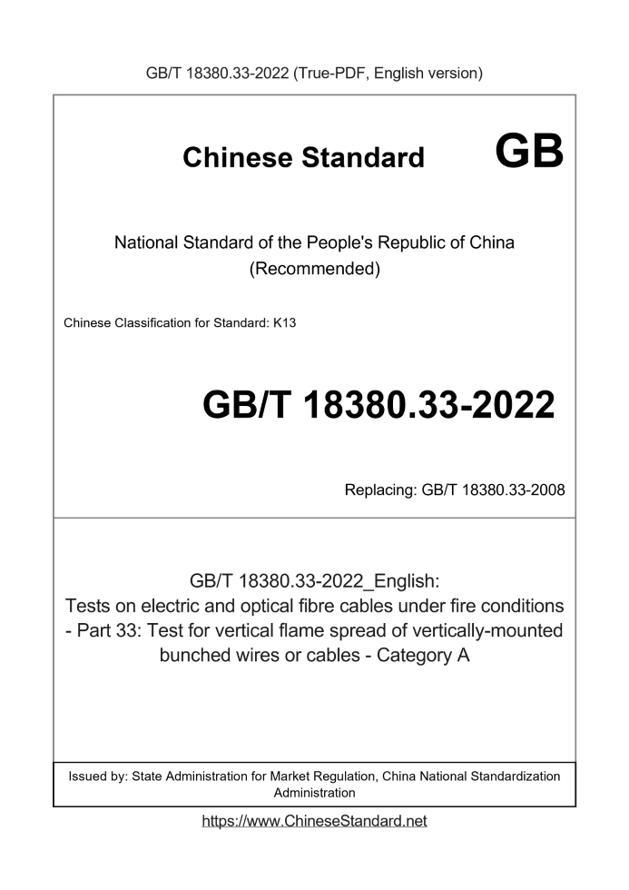 Delivery: <= 3 days. True-PDF full-copy in English will be manually translated and delivered via email. GB/T 18380.33-2022: Tests on electric and optical fibre cables under fire conditions - Part 33: Test for vertical flame spread of vertically-mounted bunched wires or cables - Category A Status: Valid GB/T 18380.33: Historical versions