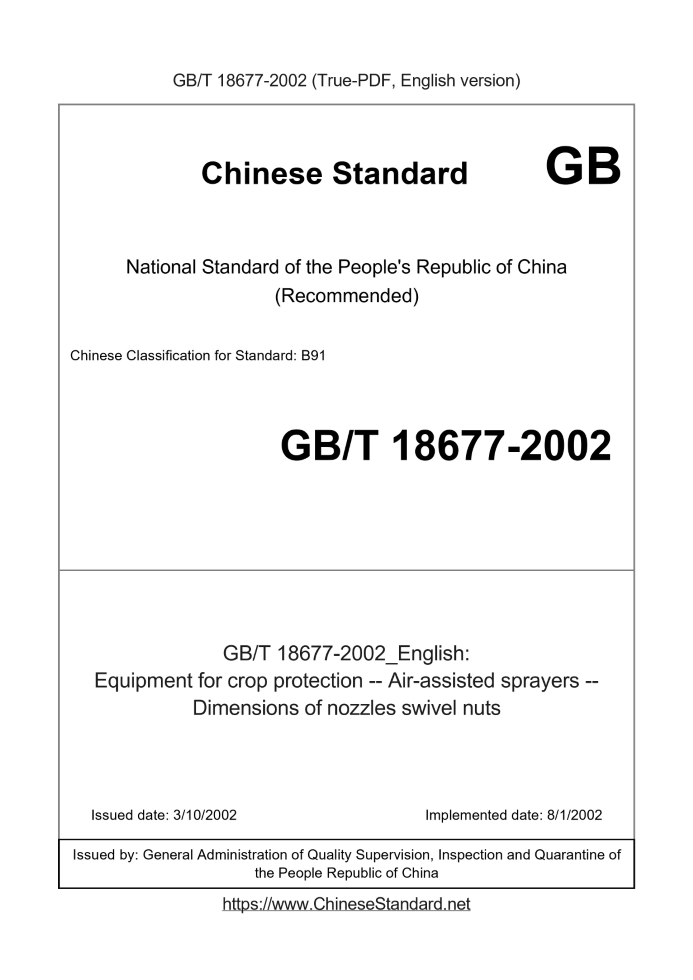 Delivery: <= 3 days. True-PDF full-copy in English will be manually translated and delivered via email. GB/T 18677-2002: Equipment for crop protection -- Air-assisted sprayers -- Dimensions of nozzles swivel nuts Status: Obsolete