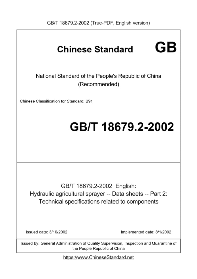Delivery: <= 5 days. True-PDF full-copy in English will be manually translated and delivered via email. GB/T 18679.2-2002: Hydraulic agricultural sprayer -- Data sheets -- Part 2: Technical specifications related to components Status: Obsolete