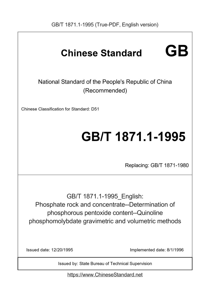 Delivery: <= 3 days. True-PDF full-copy in English will be manually translated and delivered via email. GB/T 1871.1-1995: Phosphate rock and concentrate--Determination of phosphorous pentoxide content--Quinoline phosphomolybdate gravimetric and volumetric methods GB/T 1871.1: Historical versions