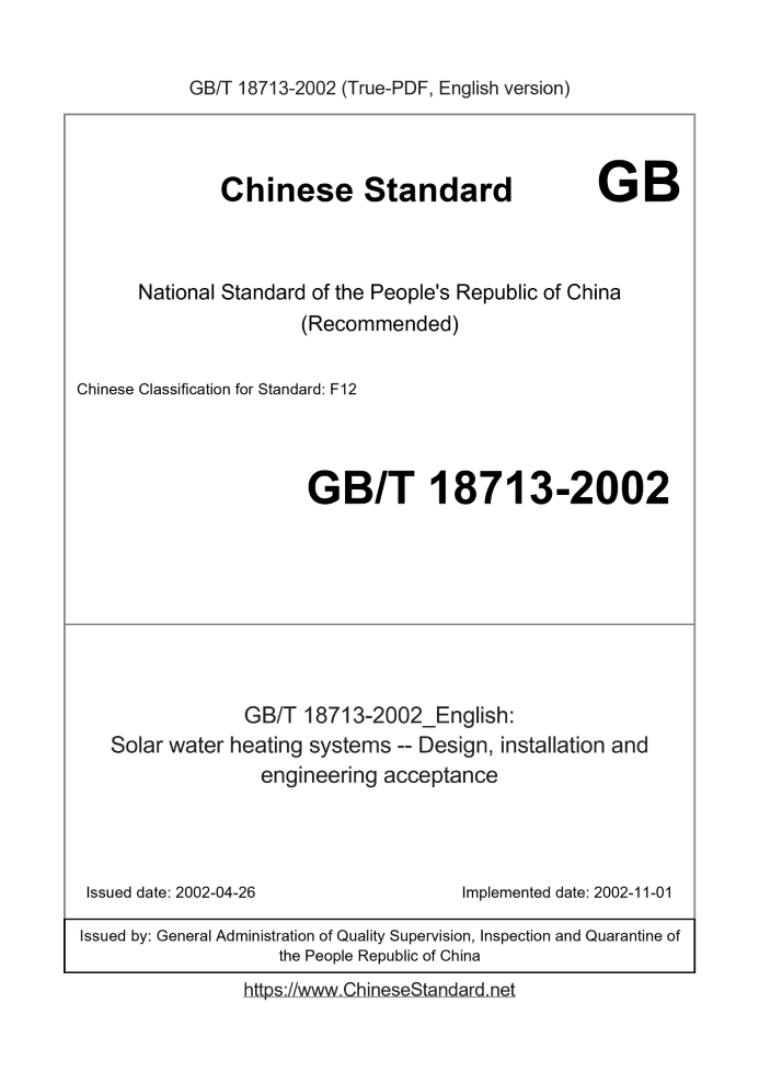 Delivery: <= 4 days. True-PDF full-copy in English will be manually translated and delivered via email. GB/T 18713-2002: Solar water heating systems -- Design, installation and engineering acceptance Status: Valid