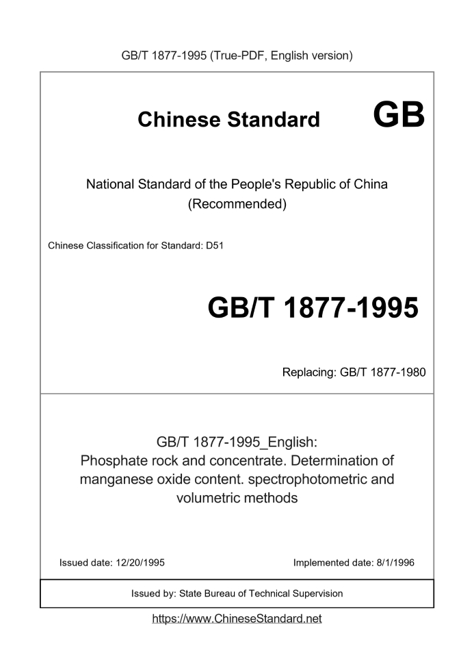 GB/T 1877-1995179 Add to Cart 2 days Phosphate rock and concentrate. Determination of manganese oxide content. spectrophotometric and volumetric methods