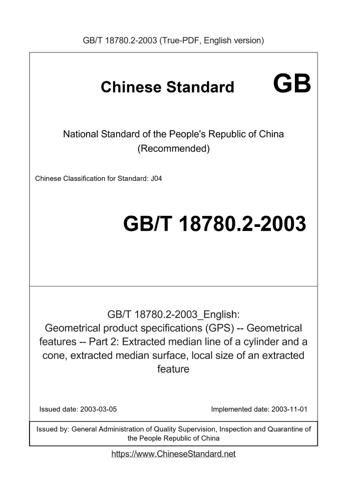 Delivery: <= 3 days. True-PDF full-copy in English will be manually translated and delivered via email. GB/T 18780.2-2003: Geometrical product specifications (GPS) -- Geometrical features -- Part 2: Extracted median line of a cylinder and a cone, extracted median surface, local size of an extracted feature Status: Valid