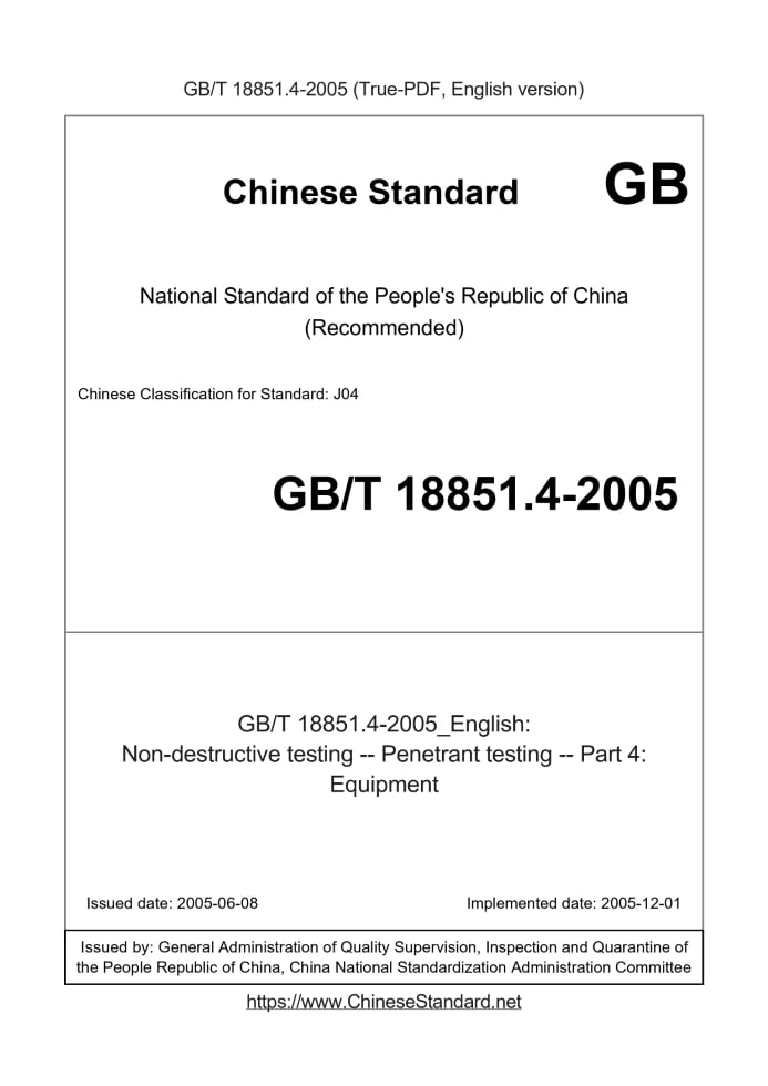 Delivery: <= 3 days. True-PDF full-copy in English will be manually translated and delivered via email. GB/T 18851.4-2005: Non-destructive testing -- Penetrant testing -- Part 4: Equipment Status: Valid