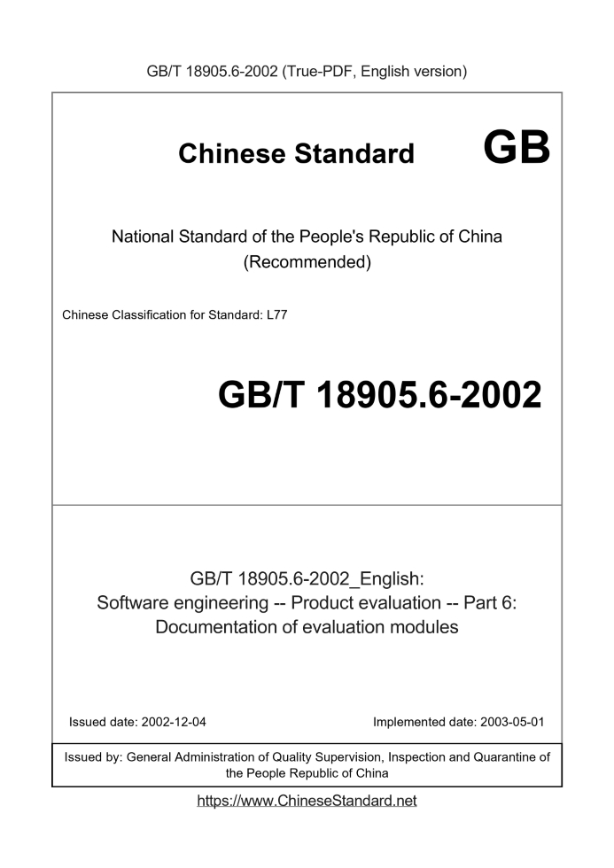 Delivery: <= 4 days. True-PDF full-copy in English will be manually translated and delivered via email. GB/T 18905.6-2002: Software engineering -- Product evaluation -- Part 6: Documentation of evaluation modules Status: Valid