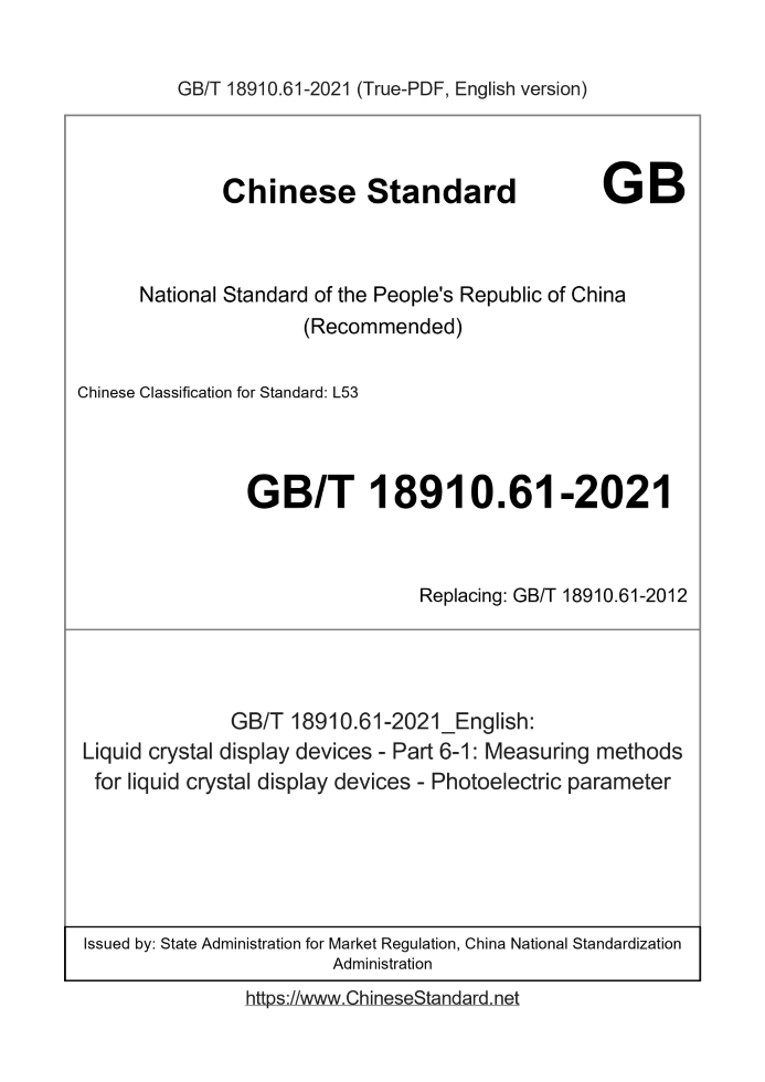 Delivery: <= 5 days. True-PDF full-copy in English will be manually translated and delivered via email. GB/T 18910.61-2021: Liquid crystal display devices - Part 6-1: Measuring methods for liquid crystal display devices - Photoelectric parameter Status: Valid GB/T 18910.61: Historical versions