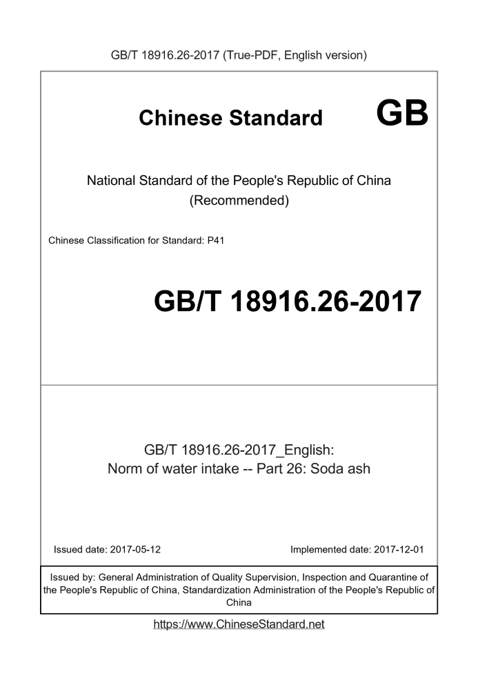 Delivery: <= 3 days. True-PDF full-copy in English will be manually translated and delivered via email. GB/T 18916.26-2017: Norm of water intake -- Part 26: Soda ash Status: Valid