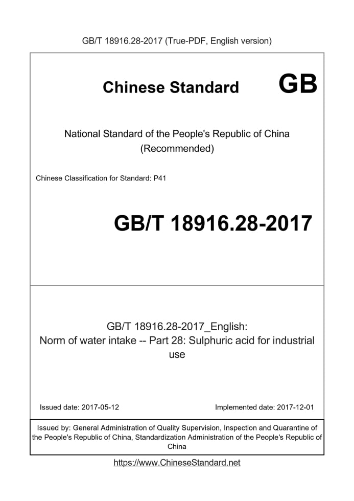 Delivery: <= 3 days. True-PDF full-copy in English will be manually translated and delivered via email. GB/T 18916.28-2017: Norm of water intake -- Part 28: Sulphuric acid for industrial use Status: Valid