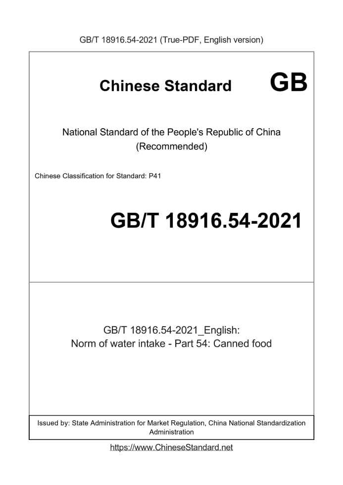 Delivery: <= 3 days. True-PDF full-copy in English will be manually translated and delivered via email. GB/T 18916.54-2021: Norm of water intake - Part 54: Canned food Status: Valid