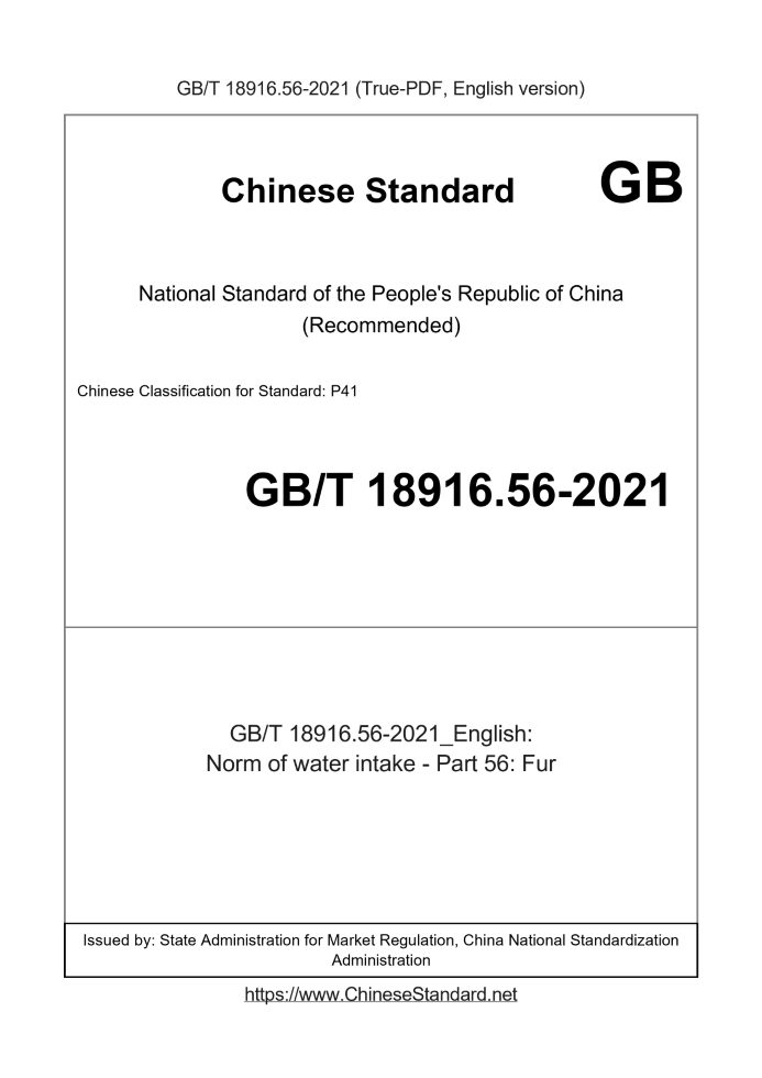 Delivery: <= 3 days. True-PDF full-copy in English will be manually translated and delivered via email. GB/T 18916.56-2021: Norm of water intake - Part 56: Fur Status: Valid
