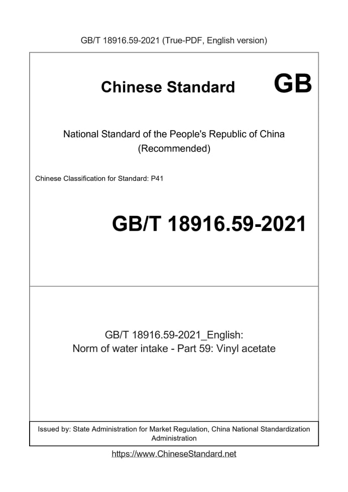 Delivery: <= 3 days. True-PDF full-copy in English will be manually translated and delivered via email. GB/T 18916.59-2021: Norm of water intake - Part 59: Vinyl acetate Status: Valid