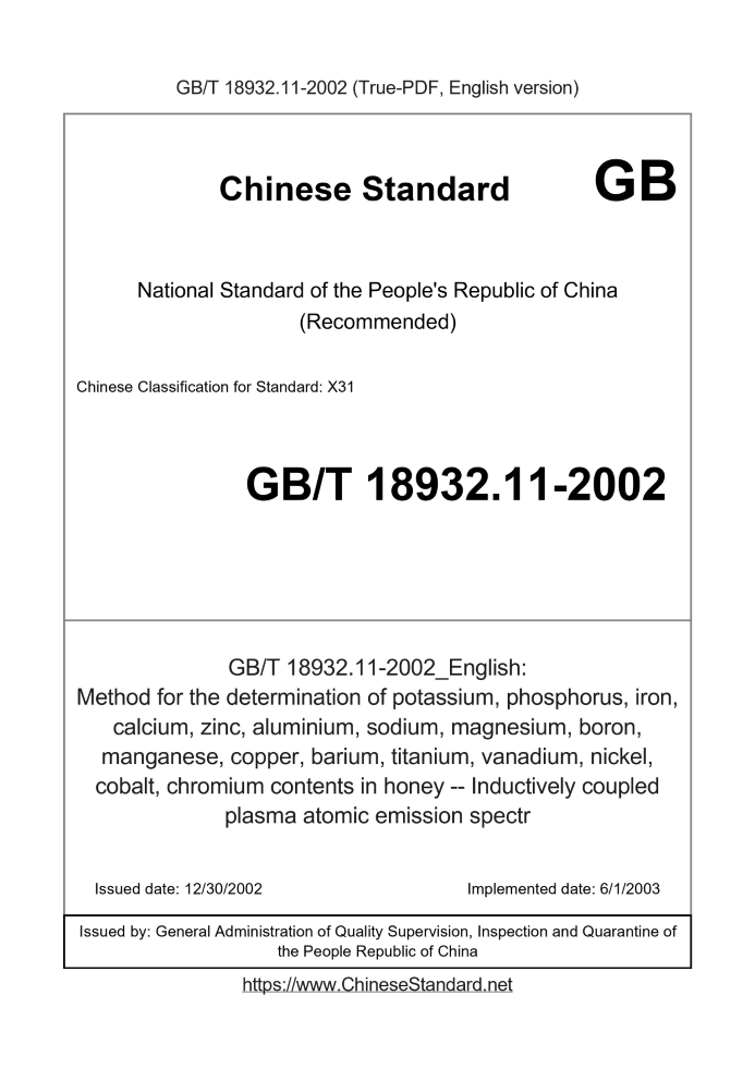 Delivery: <= 3 days. True-PDF full-copy in English will be manually translated and delivered via email. GB/T 18932.11-2002: Method for the determination of potassium, phosphorus, iron, calcium, zinc, aluminium, sodium, magnesium, boron, manganese, copper, barium, titanium, vanadium, nickel, cobalt, chromium contents in honey -- Inductively coupled plasma atomic emission spectr Status: Obsolete