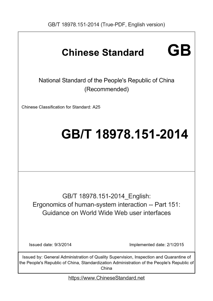Delivery: <= 3 days. True-PDF full-copy in English will be manually translated and delivered via email. GB/T 18978.151-2014: Ergonomics of human-system interaction -- Part 151: Guidance on World Wide Web user interfaces Status: Valid