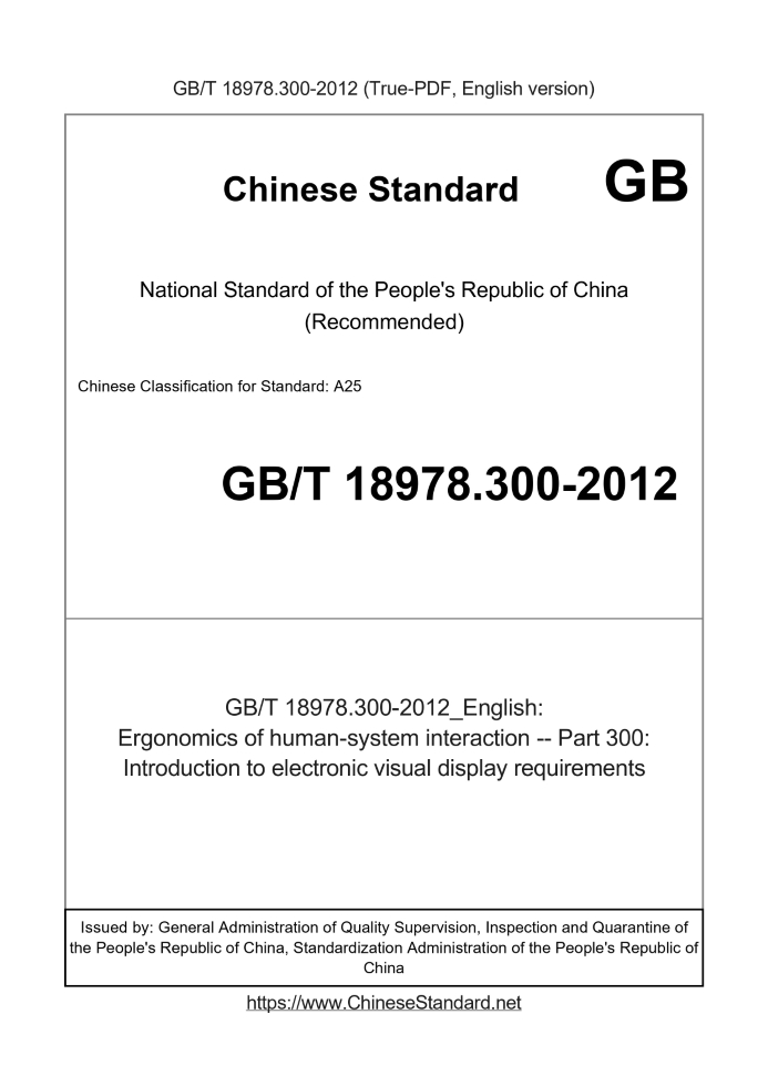 Delivery: <= 3 days. True-PDF full-copy in English will be manually translated and delivered via email. GB/T 18978.300-2012: Ergonomics of human-system interaction -- Part 300: Introduction to electronic visual display requirements Status: Valid