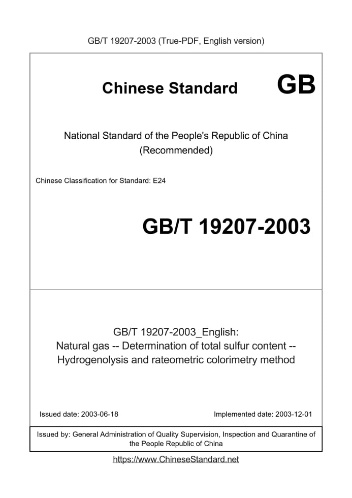 Delivery: <= 3 days. True-PDF full-copy in English will be manually translated and delivered via email. GB/T 19207-2003: Natural gas -- Determination of total sulfur content -- Hydrogenolysis and rateometric colorimetry method Status: Obsolete