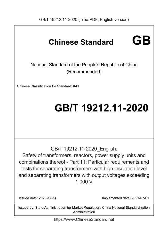 Delivery: <= 4 days. True-PDF full-copy in English will be manually translated and delivered via email. GB/T 19212.11-2020: Safety of transformers, reactors, power supply units and combinations thereof - Part 11: Particular requirements and tests for separating transformers with high insulation level and separating transformers with output voltages exceeding 1 000 V Status: Valid