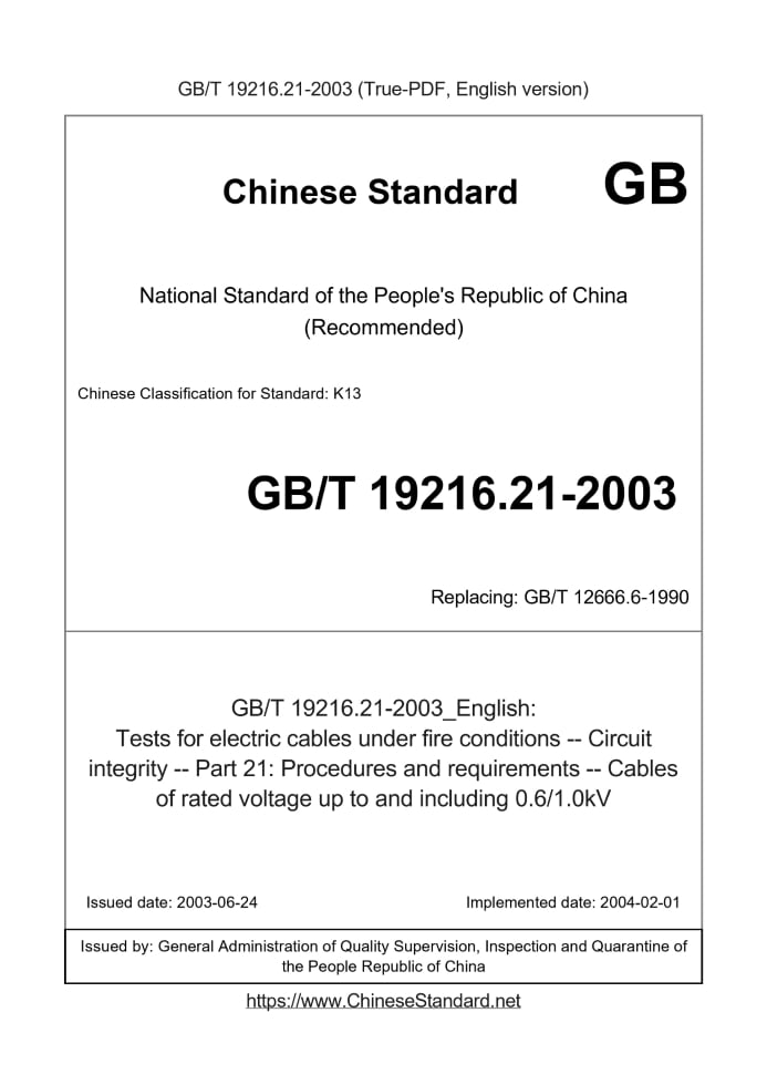 Delivery: <= 3 days. True-PDF full-copy in English will be manually translated and delivered via email. GB/T 19216.21-2003: Tests for electric cables under fire conditions -- Circuit integrity -- Part 21: Procedures and requirements -- Cables of rated voltage up to and including 0.6/1.0kV Status: Valid
